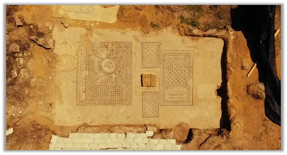O mosaico foi descoberto no piso de uma estrutura retangular que os arqueólogos identificaram como uma igreja doméstica (domus ecclesiae) – um tipo de espaço de culto comum antes da legalização do cristianismo, quando comunidades cristãs adaptavam residências privadas para reuniões religiosas.